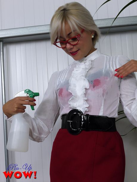 Pin Up Wow: Asian secretary Petra strips at work & shows her amazing racks & ass in stockings