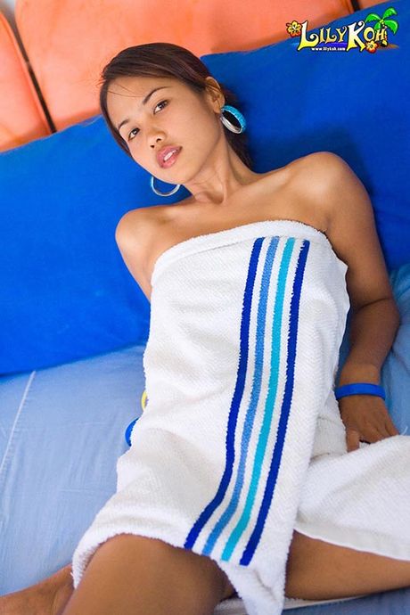 Lily Koh: Brown Thai cutie Lily Koh wearing only a towel and shy smile