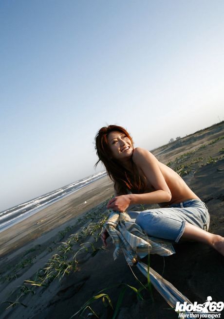 Idols 69: Hot japanese teen Yu Satome in jeans shows big hooters and sexy butt at beach
