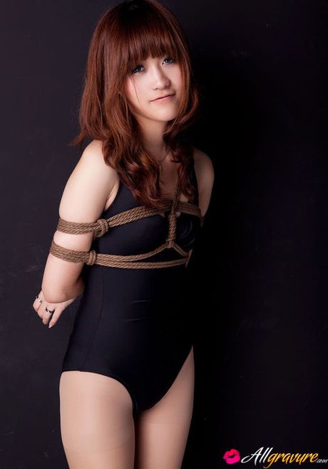 All Gravure: Lala Asian babe in bath suit has hands tied of her boobs in ropes